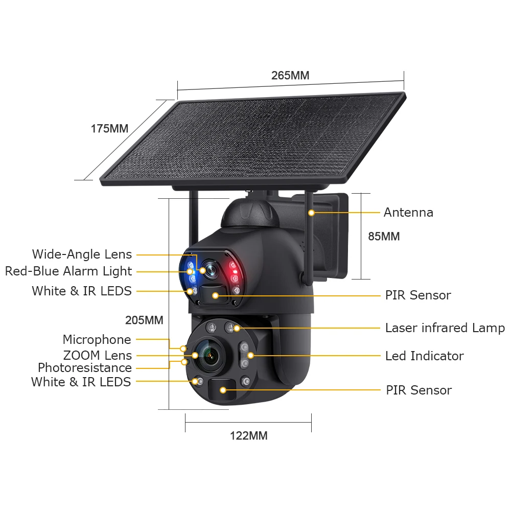 This solar surveillance camera delivers superior night performance using 2 laser lights and 10 IR/white LEDs, offering clear long-range night visibility up to 50 meters. The bullet-and-PTZ linkage allows users to preview a wide-angle image first and then zoom in to view critical details. The all-metal PTZ housing improves heat dissipation, prevents lens overheating, and ensures stable nighttime clarity in hot outdoor environments.